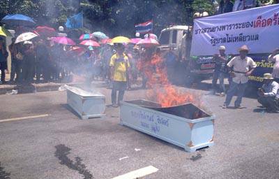 จังหวัดระยอง และหน้าศูนย์ราชการ ฯ เพื่อเรียกร้องรัฐบาลแก้ปัญหาราคายาง พร้อมเผาโลงศพ
