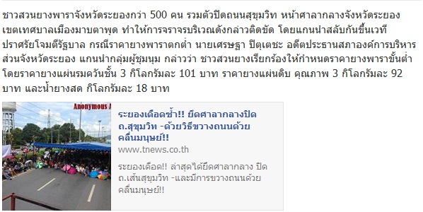 ชาวสวนยางพาราจาก 8 อำเภอของจังหวัดระยองและจังหวัดชลบุรีมากกว่า 700 คน ได้รวมตัวปิดถนนสุขุมวิทขาเข้า