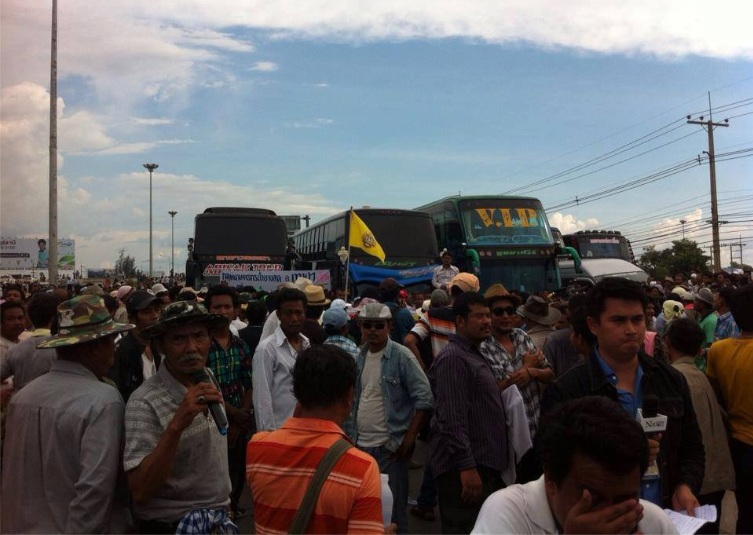 เกษตรกลุ่มน้ำยางสด อ.เทพา จ.สงขลา ประมาณ 500 คน เดินทางโดยรถบัสโดยสารปรับอากาศ 5 คัน สวมผ้าโพกหัวระบุว่า
