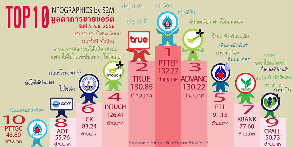 ADVANC ขึ้นอันดับ 1 มูลค่าชอร์ต 180 ล้านบาท TRUE-PTT ติดอันดับ 2-3 Infographics by S2M