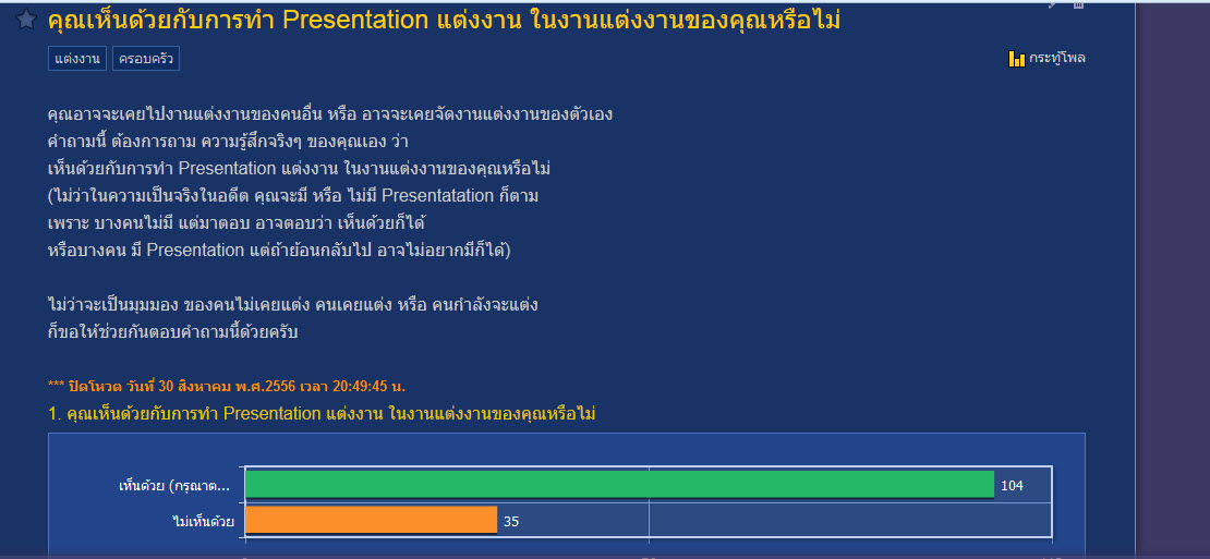 เรื่อง คุณเห็นด้วยกับการทำ Presentation แต่งงาน ในงานแต่งงานของคุณหรือไม่