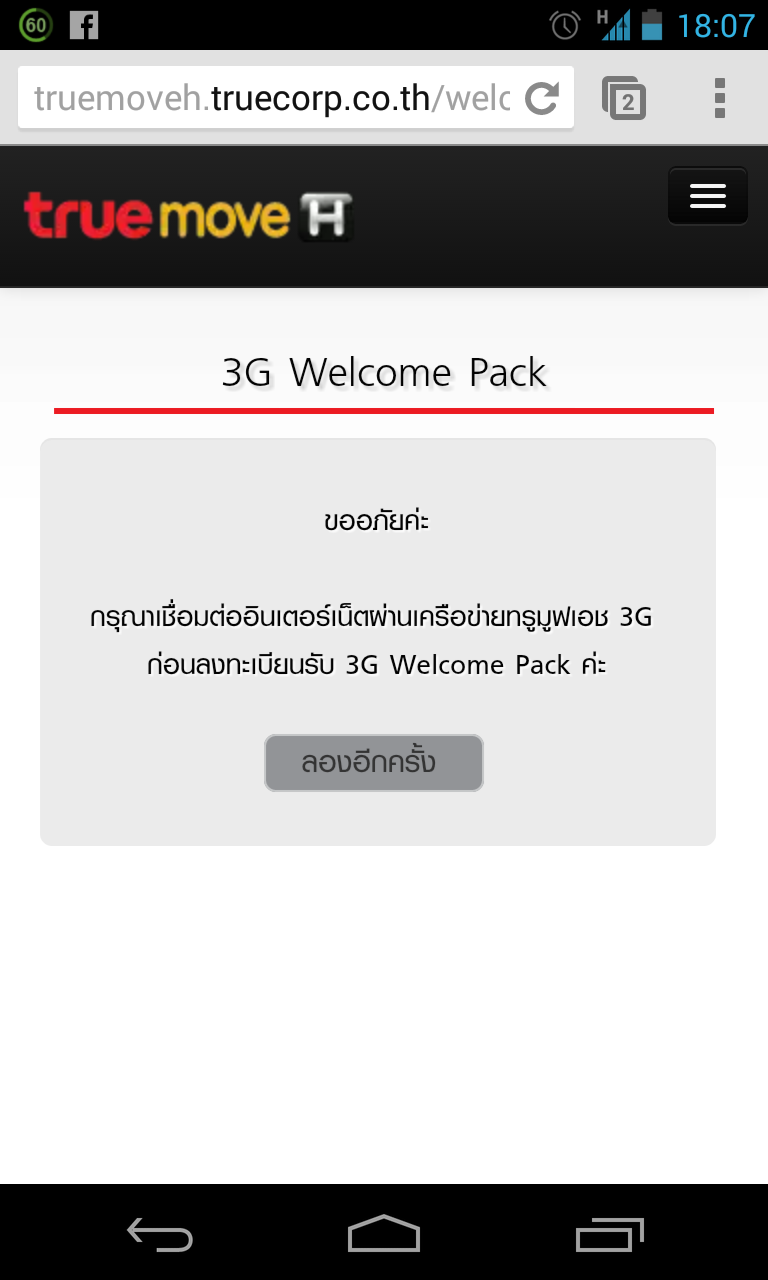 เครื่อง Golive 2 กดรับ 3G ฟรี ไม่ได้หรอครับ ??? ผมกดแล้วก็มีข้อความส่งมาว่า "ขอบคุณค่ะ ยืนยันรับ 3G Welcome Pack เพียงคลิก URL ลิ้งค์" พอผมกดเข้าไปแล้ว ก็ขึ้นว่า "ขออภัยค่ะ ระบบไม่สามา