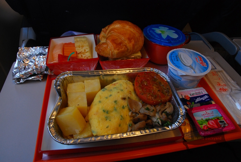 รูปอาหารเช้าบนเครื่องค่ะ รสชาติพอทานได้ค่ะ ออกจะรสอ่อนๆ คนต่างชาติคงชอบค่ะ แต่สำหรับไทย คงคิดว่าจืดไปหน่อย