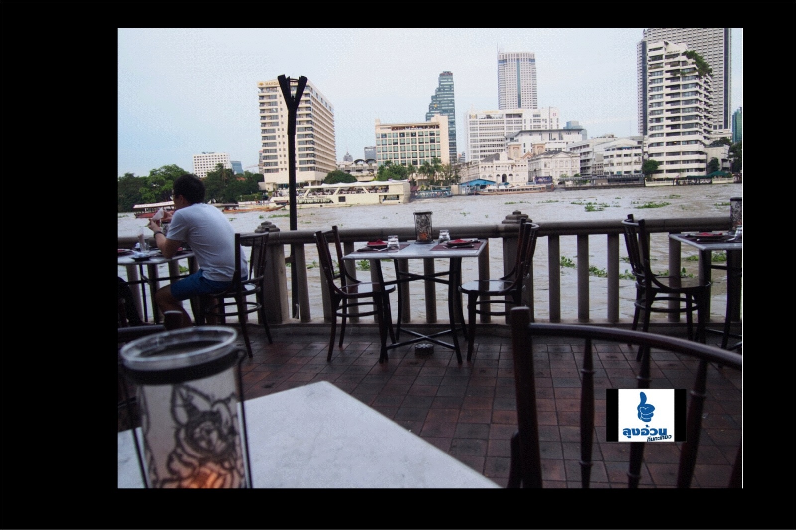 สวัสดีครับพอดีมื้อเย็น คนใกล้ตัวอยากไปทานที่นี่ครับ ก็ ตามสบาย เรามันแค่คนขับรถ. ห้องนี้ครับ นั่งด้านนอก ริมน้ำเจ้าพระยา อืมม วันนี้ภาพอาจดูเร่งรีบนะครับ เพราะเป็นแขกต่างชาติ 80 % ไม่อย
