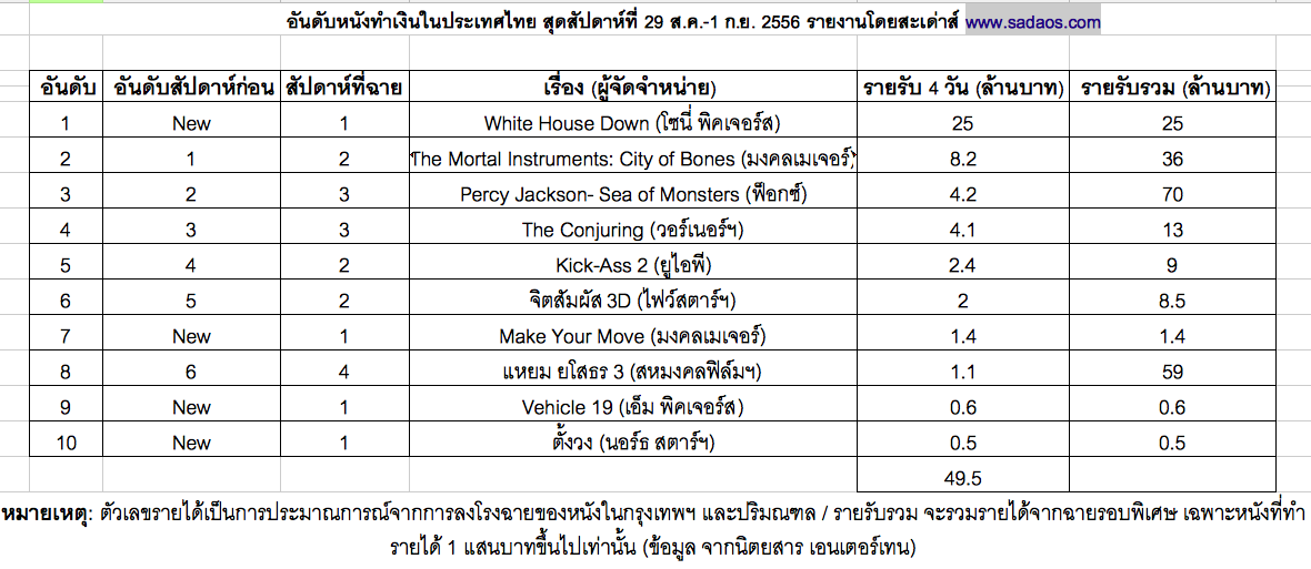 หลังหนังในสิบอันดับแรก ทำเงินรวมกันเกิน 50 ล้านบาทมาตลอด นับตั้งแต่สุดสัปดาห์ที่ 19 พฤษภาคม ซึ่งหนังในชาร์ททำเงินรวมกันแค่ 38 ล้านบาท สัปดาห์ท่ีผ่านมาเป็นสัปดาห์แรกที่หนังในชาร์ททำเงินรวมกันไม่ถึง 50 ล้าน โดยหย่อนไปเพียงแค่ครึ่งล้านเท่านั้น ดูอันดับหนังทำเงินในบ้านเรา สัปดาห์ผ่านๆ มาได้ที่ http://www.sadaos.com/tag/thailand-box-office-2013/