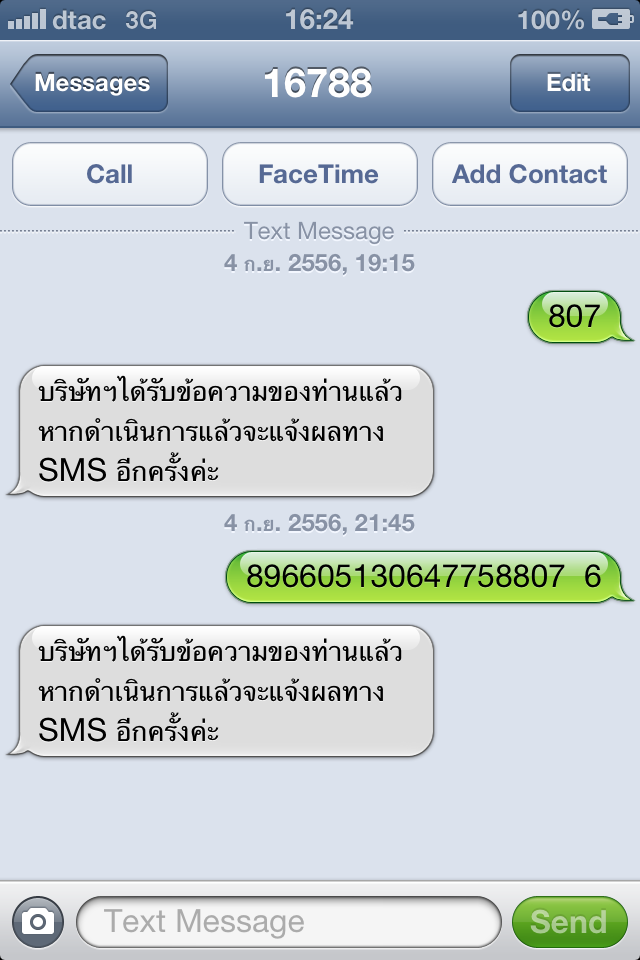 SMS ที่เบอร์ 16788 ไปครั้งแรกพิมพ์ 807 ตามรูปครับ แล้วก็มีการแจ้งกลับมาว่าได้รับ SMS แล้ว ก็เลยรอไปสักพัก จนมี SMS