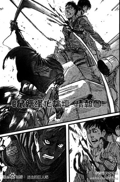 - ไททันเป็นฝูงพุ่งเข้าหาไรเนอร์กับยูมิลทันที รุมกัดจนไรเนอร์ต้องปล่อยมือที่กันเบลไว้ออกมาสู้