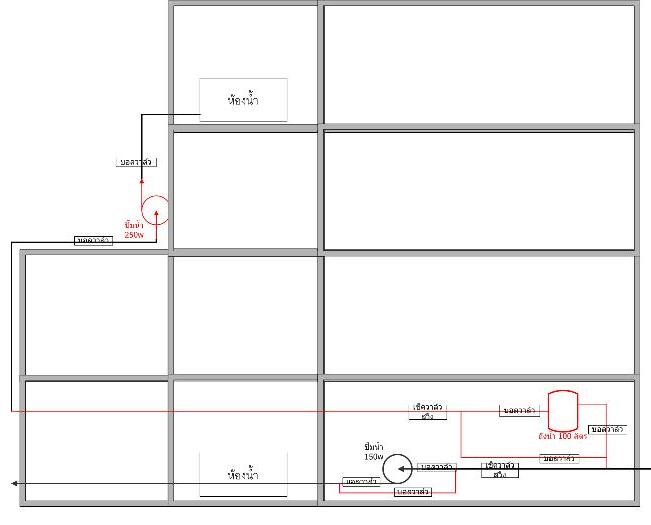 คือเดิมท่อน้ำเดิมเดินไปยังห้องน้ำชั้น 1 และชั้น 4 โดยมีปั๊มน้ำที่ชั้น 3 ดึงไปครับ ทีนี้ปัญหาคือใช้น้ำชั้น 4 ชั้น 1 น้ำก็จะขาด ประกอบกับปั๊มน้ำ ชั้น 3 เจ๊งไป พ่อดันไปเปลี่ยนแบบ 150w มา น้ำชั้น 4 เลยไม่แรงไปอีก ทีนี้ก็เลยจะปรับคิดได้ดังภาพครับ (สีแดงของใหม่ สีดำของเก่า)