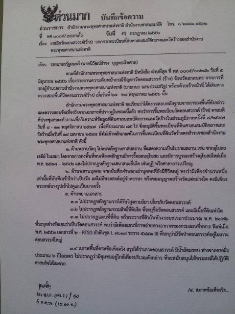 บางส่วนบันทึกข้อความในหนังสือสำนักพุทธ เรื่องยกเลิกและถอนชื่อวัดดอนสวรรค์ ออกจากทะเบียนที่ดินฯ