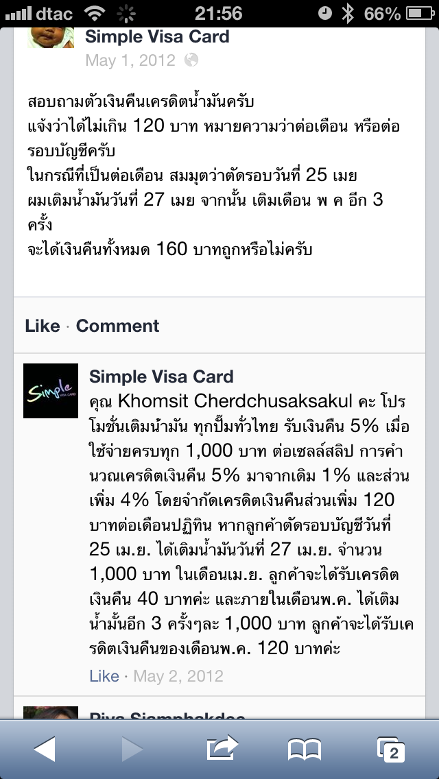 - Simple visa card จากเดิมที่ได้เงินคืนน้ำมัน 5% สูงสุด 120 บาทต่อเดือน. กลายเป็น 3% ทุกๆ 800 บาท จำกัดไม่เกิน 48 บาท ในปีนี้