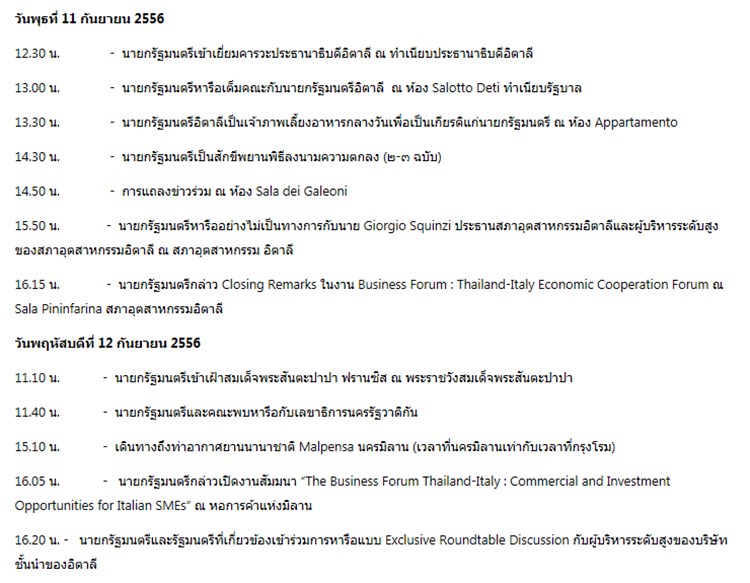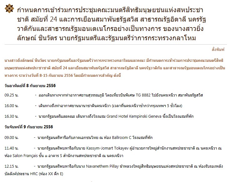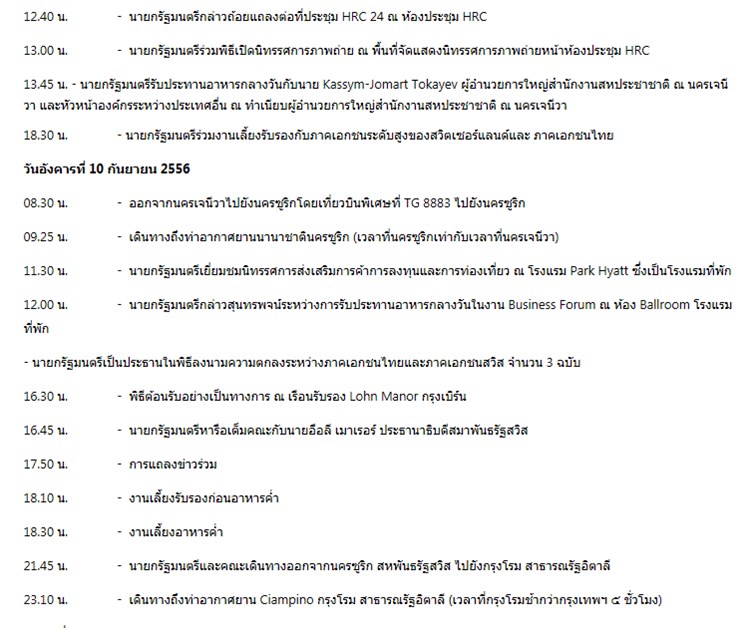 การเดินทางไปต่างประเทศของนางสาวยิ่งลักษณ์ ชินวัตร นายกรัฐมนตรี พร้อมคณะ 81 คน ระหว่างวันที่ 8-15 ก.ย.56 โดยมีกำหนดการไป 3 ประเทศ ประกอบด้วย การเยือนสมาพันธรัฐสวิส สาธารณรัฐอิตาลี และมอนเตเนโกร (ซึ่งเด