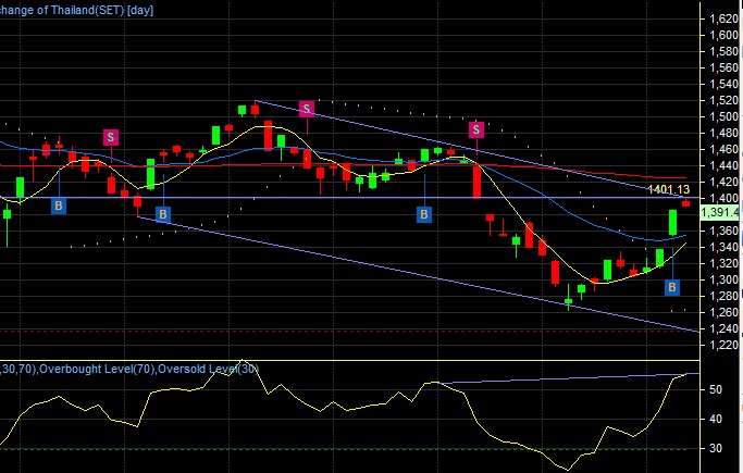 น้องสี่ว่าเหมือนกราฟกำลังจะทำเป็นรูปแบบ Cup with handle หรือเปล่านะ? แต่คงต้องรอดู Indicators ประกอบอย่าง MacD , RSI และ Slow Stochastic ด้วยนะว่า ถ้าดัชนีทำ New High แล้ว Indicators เหล่านี้จะทำ New