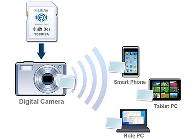 ถ่าย & แชร์ ทันที โดยโอนไฟล์รูปจากกล้อง ผ่านสัญญา Wireless LAN ในตัว Toshiba Flashair ไปสู่เครื่องคอมพิวเตอร์พีซี โน๊ตบุค สมาร์ทโฟน หรือ แท็บแล็ต ได้หลายเครื่องในเวลาเดียวกัน โดยไม่ผ่าน Card Reader หรือแม้จะไม่สัญญาณ 3G ก็สามารถ แชร์ได้อย่างไร้ขีดจำกัด ในทุกสถานที่