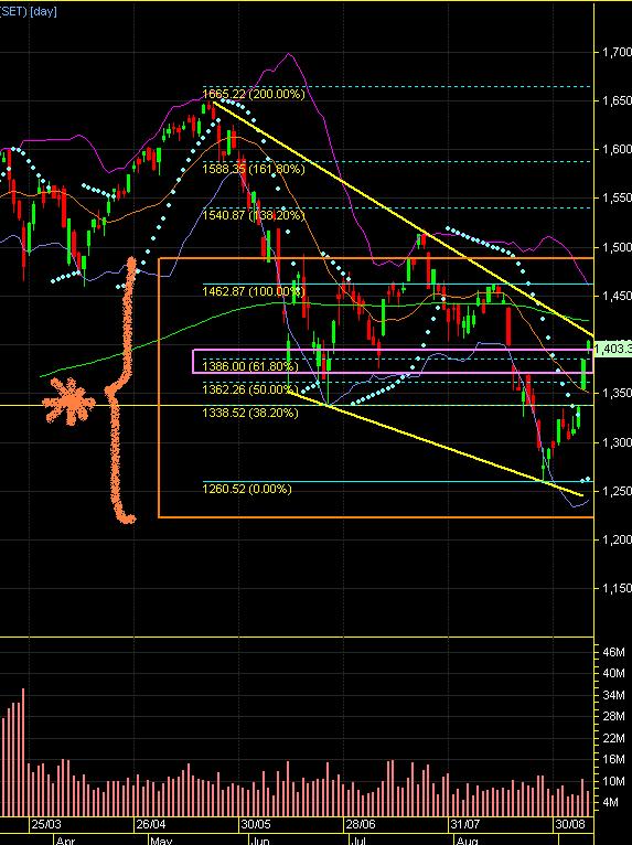วันนี้ Set พยายามยืนเหนือแนวต้านที่ 3 ของคลื่น C4 ที่แนว Fibonacci 61.8% ซึ่งปกติในคลื่น 4 ไม่ควรทะลุแนวนี้ ทำให้ถ้าวันนี้เกิดยืนเหนือแนว 1387.5 จุดจนปิดวันได้จะมีผลกระทบโดยรวมต่อทั้งคลื่น C โดยตอนนี้แยกเป็น 2 ประเด็นคือ 1.ยืนได้และเลือกไปทดสอบแนวเปลี่ยนเทรนก่อนเวลากับ 2.เลือกลงมาอยู่ในกรอบเดิมและย่อตัวไม่มี New Low โดยจุดเปลี่ยนที่ทำให้คลื่น C4 เปลี่ยนไปจากที่คาดเพราะมีกองทุนมาช่วยซื้อไล่ราคาจากที่ Prop Trade ดันขึ้นมาและต่างชาติมีการซื้อเพิ่มขึ้น 2 เหตุผลนี้เหนือความคาดหมายทำให้การขึ้น C4 แรงกว่าที่คาดไว้ แต่พวกเราต้องแก้เกมครั้งนี้