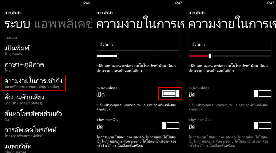 การตั้งค่า > ความง่ายในการเข้าถึง > ความคมชัดสูง "ปิด"