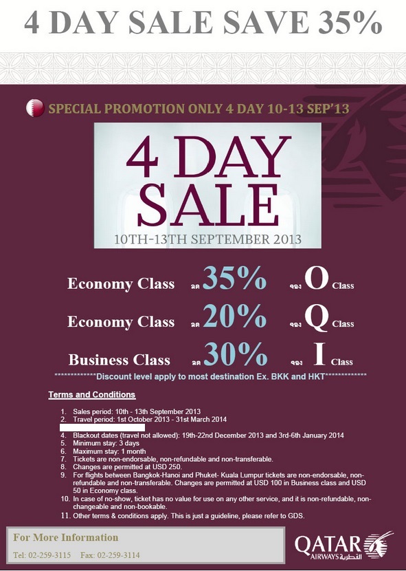 โปรโมชั่น QATAR AIRWAYS 4 DAY SALE SAVE 35 %