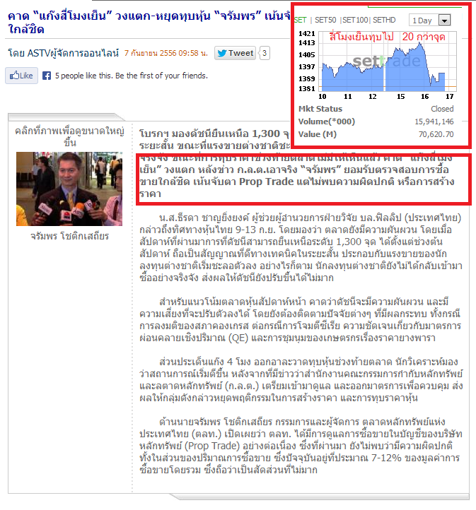 ไทยรัฐออนไลน์ 20 พฤศจิกายน 2556, 05:45 น. โบรกฯ ยัน "แก๊งสี่โมงเย็น" ไม่ใช่ตัวการทำหุ้นร่วง ชี้เป็นการซื้อขายหลักทรัพย์ตามปกติ แต่เกิดปรากฎการณ์ชัดเจนเมื่อหุ้นร่วงหนัก ในขณะที่ ก.ล.ต. หารือ