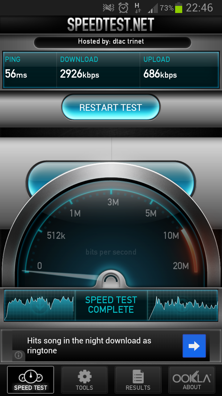 อันนี้ความเร็วของ DTAC 3G 850 อันนี้ความเร็วของ DTAC TriNet 2100 ถ้าไม่เห็นตัว H+ นึกว่าใช้ EDGE 2G อยู่นะนี่ บริเวณ ซอยพิบูลย์สงคราม 22 ใกล้สะพานพระราม 5 ครับ เป็นแบบนี้มาเกือบสองปีแล้ว คืนนี้ผม