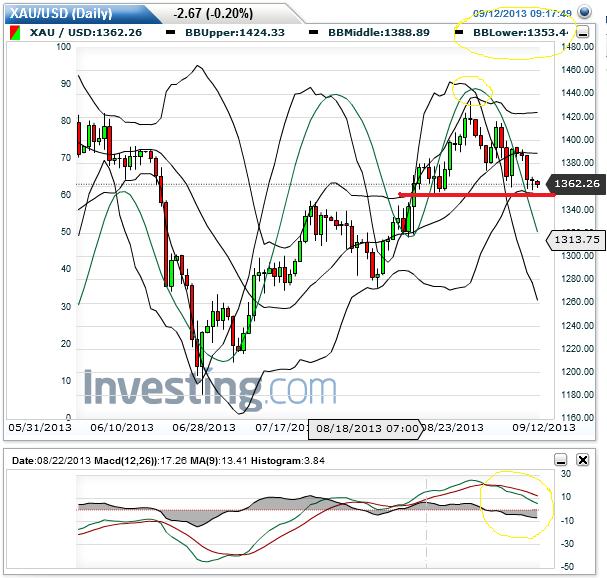 ตามกราฟครับ ราคาทองคำเมื่อวานหลุดแนวรับเรียบร้อยที่ 1,355 usd/oz จากกราฟราคาทองคำรายวันยังคงเป็นขาลง ขา S ยังได้เปรียบ slow sto ยังไม่กลับตัว macd ยังลงต่อ ราคายังเคลื่อนไหวต่ำกว่าเส้นค่าเฉลี่