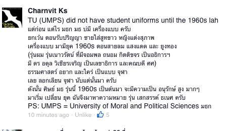 *การแต่งกายของนศ.ธรรมศาสตร์มันก็เป็นเรื่องในมหาลัย ไม่ได้บอกให้ทุกม.เปลี่ยนเป็นเหมือนกับธรรมศาสตร์