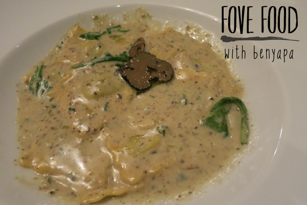 Ravioli crema di tartufo rucola e porcini - ravioli served with truffle cream, porcini mushrooms and rocket salad 480 บาท