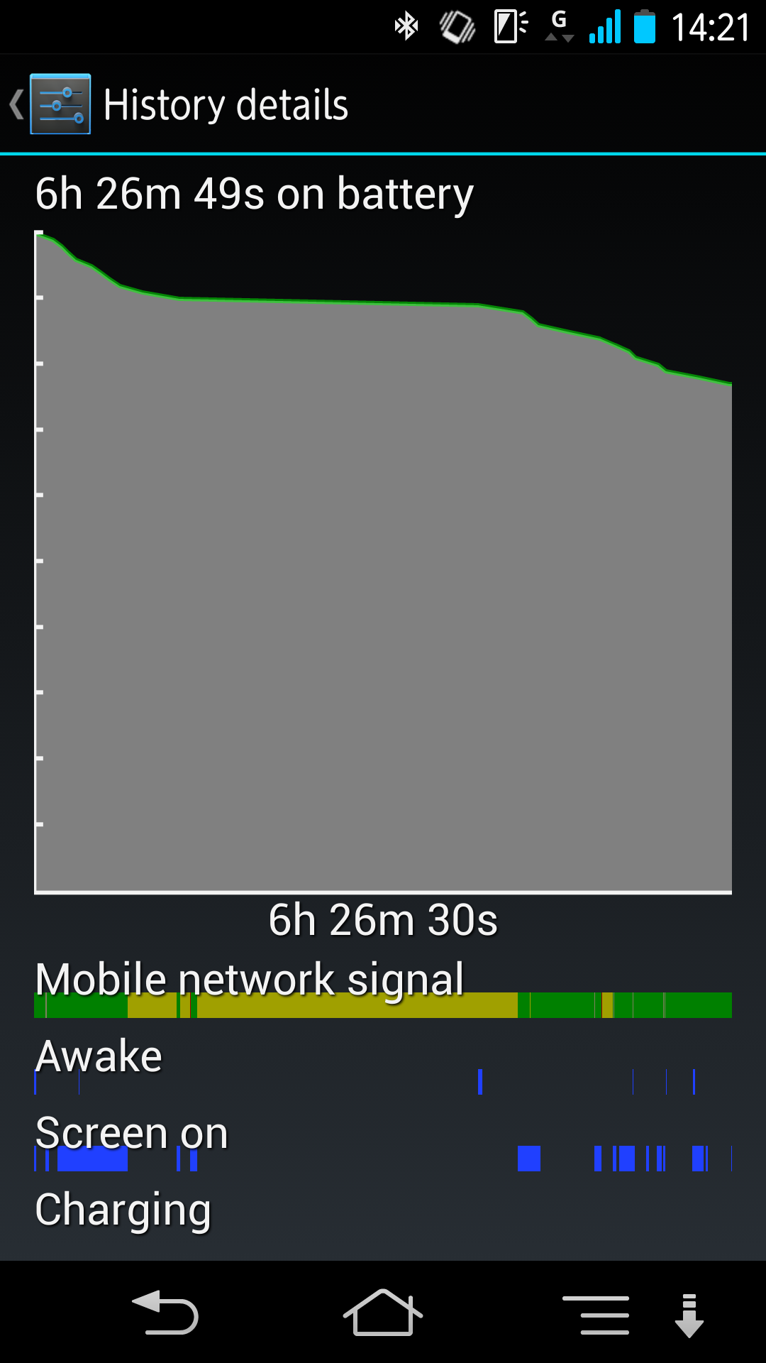 วันนี้เหมือนบางช่วงมือถือมันอุ่นนิดๆ และเหมือนแบตจะลดเร็วด้วย ไม่ทราบว่าเกี่ยวไหมครับว่าสัญญาณโทรศัพท์ไม่นิ่ง เห็นจากกราฟเป็นสีเหลืองเป็นบางช่วงครับ