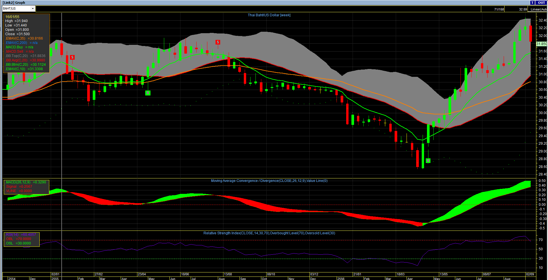 ค่าเงินบาทอ่อนค่าจากช่วงเช้า http://www.bloomberg.com/quote/USDTHB:CUR TF WEEK สัปดาห์นี้ปิดได้แท่งเขียว Rainbow BandsกำลังบิดตัวกลับในTF WEEKครับ แท่งเทียนถูกดึงกลับเข้ามาในLBand แล้วในTF Week เ