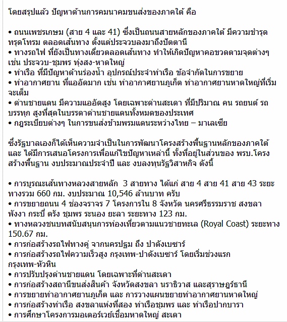 โดยสรุปแล้ว ปัญหาด้านการคมนาคมขนส่งของภาคใต้ มีดังนี้..