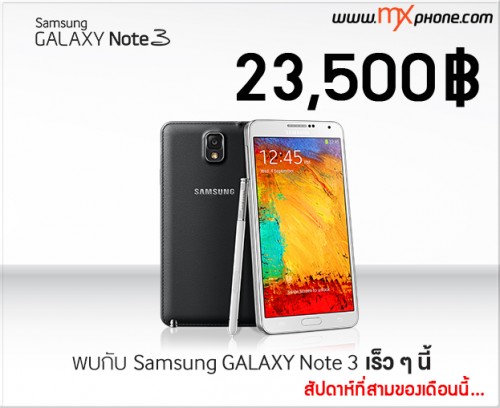 ในที่สุดทีมงาน MXPhone ก็ได้ราคา Samsung Galaxy Note 3 อย่างเป็นทางการมาฝากเพื่อนๆ กันแล้ว!! หลังจากรอคอยกันมานานแสนนาน โดยเครื่องเตรียมวางจำหน่ายอย่างเป็นทางการในราคา 23,500 บาท ซึ่งมีกำหนดขายในช่วงสัปดาห์ที่สามของเดือนนี้แล้วด้วย..