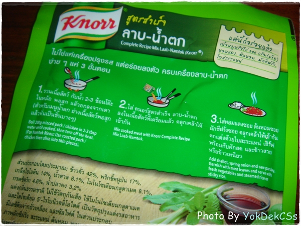 ลาบหมูที่หยกจะทำในวันนี้ หยกจะใช้คนอร์สูตรสำเร็จ ลาบ-น้ำตก เพื่อช่วยลดเวลาสำหรับคนมีเวลาน้อยเหมือนหยก