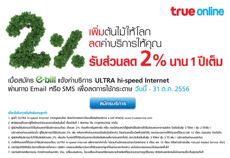 เห็นทาง True โฆษณาว่าจะให้ส่วนลดค่าบริการถ้ามีการสมัครรับใบแจ้งยอดอิเล็กทรอนิกส์ ดิฉันได้สมัครรับ e-bill ตั้งแต่วันที่ 10 ก.ย. 2556 ตอนนี้ดิฉันได้รับ e-bill (2 รอบบิล) แล้ว ยังพบว่าไม่เห็นมีส่วนลดค่า