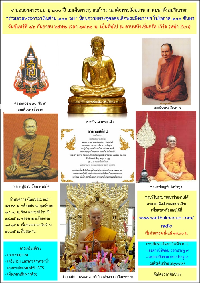 ในวันที่ 15 - 19 กันยายน 2556 ทางคณะกรรมการจัดกิจกรรมร้อยดวงใจ ถวายพรชัย 100 ชันษา สมเด็จพระสังฆราชฯ