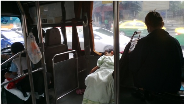รูปนี้ถ่ายเมื่อวันอาทิตย์ 15/9/56 เวลา 13.00 น. บนรถปรับอากาศ ขสมก.สีส้ม สายหนึ่ง จากรูปจะเห็นเด็กเสื้อสีขาวนั่งอยู่ข้างพขร.(หญิง) ได้ยินจากที่คุยกันว่าเป็นบุตรชายของพขร.เอง ส่วน น้องที่นอนหลับอยู่ได้ยินว่าเป็นหลานของ พกส.(นั่งเก้าอี้ตัวถัดไป) ที่เสาสแตนเลสด้านหลังน้องเสื้อขาว มีถุงพลาสติกแขวนอยู่ 1 ใบในนั้นมี ทั้งขวดนม น้ำและน้ำส้มพร้อม