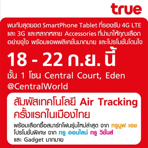 - สัมผัสเทคโนโลยี Air Tracking ครั้งแรกในเมืองไทย และพบกับสุดยอด SmartPhone Tablet ที่รองรับ 4G LTE และ 3G และหลากหลาย Accessories ที่นำมาให้คุณเลือกอย่างจุใจ พร้อมแอพพลิเคชั่นมากมาย และโปรโมชั่นโดนใจ