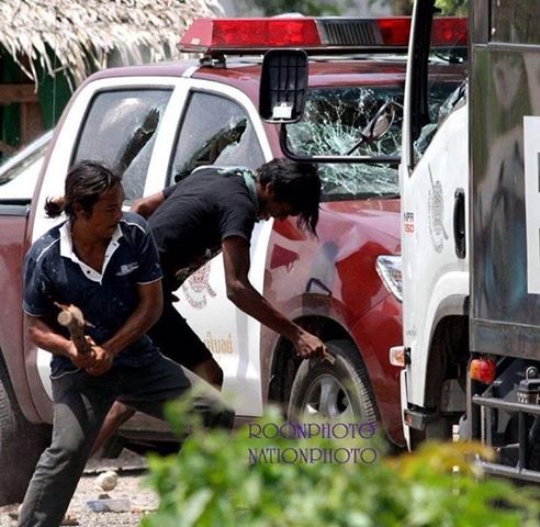 ตามที่สื่อและพวกมันอ้างว่าตำรวจเผารถเอง.. ดูจากภาพครับ ว่าพวกถ่อยมันยึดรถได้แล้ว และกำลังกรีดยางรถยนต์ของตำรวจอยู่..จากภาพชัดเจนว่าเป้นรถตำรวจ2คัน ถ้าตำรวจยังอยู่ตรงนั้น..มันทำไม่ได้ครับ ..... นั่น