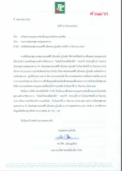 บริษัทไทยพรีเมียร์ลีกแจ้งหนังสือเลื่อนการแข่งขันระหว่าง ปลาทูคะนอง พบ กิเลนผยอง มาเล่นกันในวันเสาร์ที่ 21 กันยายนแล้ว