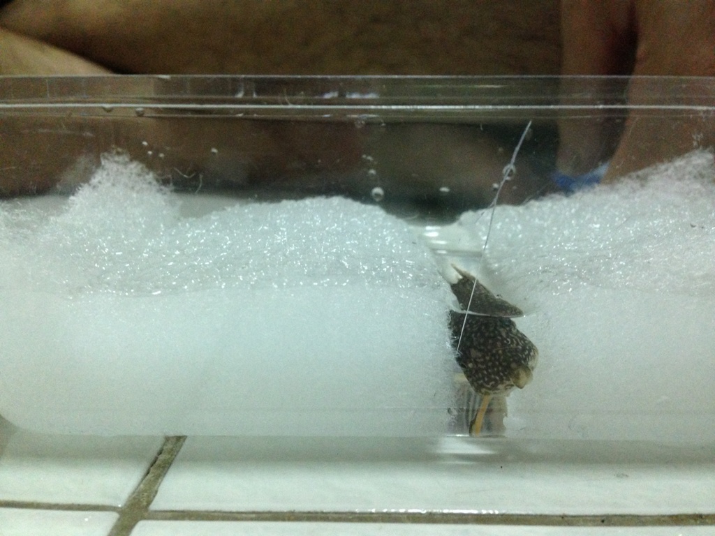 ปลาสอดกระโดดออกมานอกตู้ พอเราใส่กลับตู้ น้องเอาแต่นอนก้นตู้ กลัวน้องตาย!