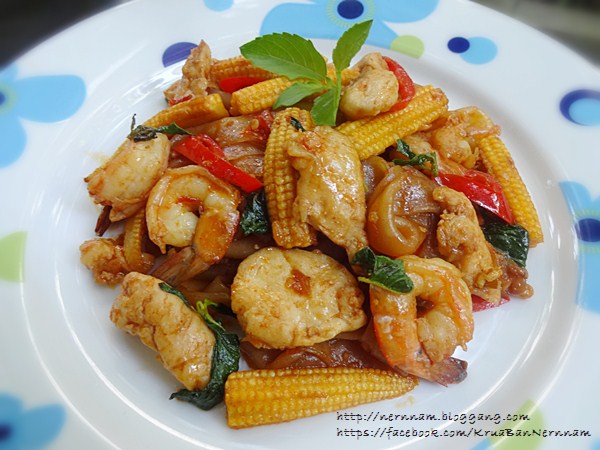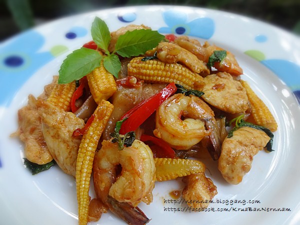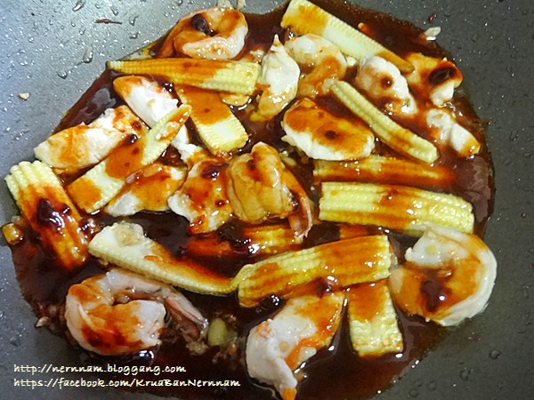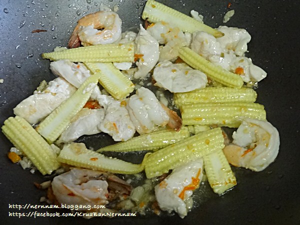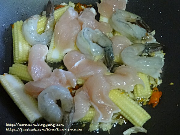 4. ใส่ข้าวโพดอ่อนลงผัด ตามด้วยไก่และกุ้ง ผัดพอสุก