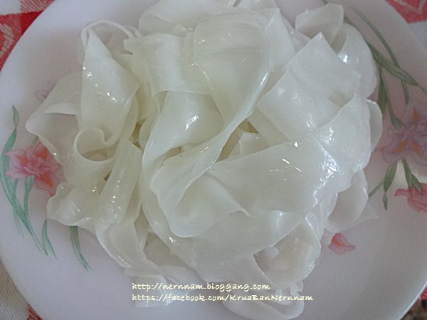 1. ก๋วยเตี๋ยวเส้นใหญ่นำมาคลี่ออกเป็นเส้นไม่ให้ติดกัน