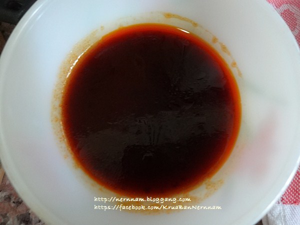 2. น้ำพริกเผา ซอสหอยนางรม น้ำปลาและน้ำตาล ผสมทุกอย่างให้เข้ากันเติมน้ำเปล่าเล็กน้อย