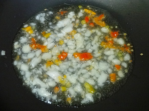 3. ตั้งกระทะน้ำมันอุ่นเล็กน้อย ใส่พริกและกระเทียมสับลงไปผัด ไม่ต้องให้เหลือง