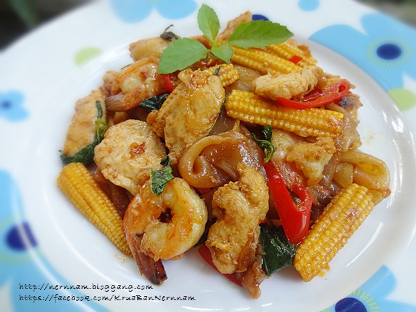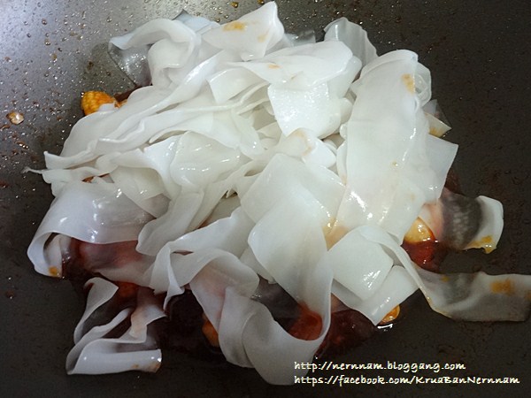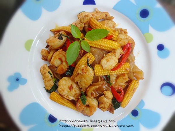 [CR] +**+ อาหารบ้าน ๆ ที่บ้านเนินน้ำ .... ก๋วยเตี๋ยวเส้นใหญ่กุ้งไก่ผัดน้ำพริกเผา +**+