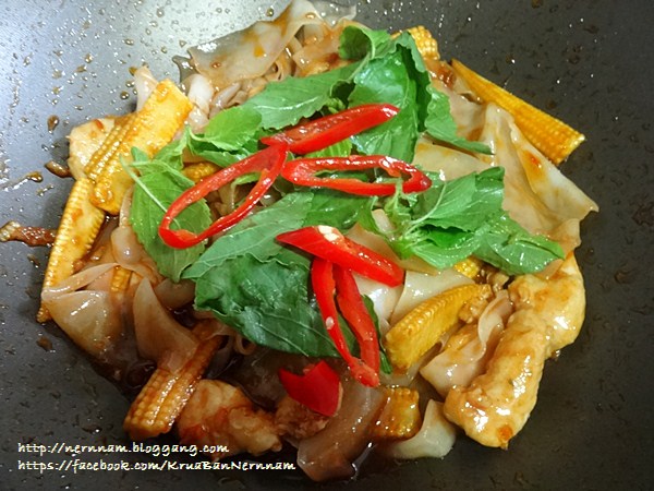 6. ใส่ก๋วยเตี๋ยวลงผัดให้เข้ากัน แล้วใส่พริกชี้ฟ้าแดงและใบโหระพา ผัดให้เข้ากัน