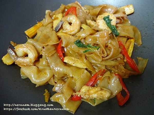 สวัสดีค่ะ วันนี้พบกันอีกเช่นเคยนะคะ กับอาหารจานเดียว ทำง่าย ๆ "ก่วยเตี๋ยวเส้นใหญ่กุ้งไก่ผัดน้ำพริกเผา" ใครไม่ชอบเส้นใหญ่ ก็เปลี่ยนเป็นเส้นอื่น ๆ ได้ตามความชอบ ใครไม่ชอบกุ้งไก่ ก็เปลี่ยนเป็นเนื้อสัตว์อื่น ๆ ได้ตามความชอบเช่นกันค่ะ ตามมาอร่อยด้วยกันนะคะ ส่วนผสมและวิธีทำ ก๋วยเตี๋ยวเส้นใหญ่ หรือจะเปลี่ยนเป็นเส้นอื่นก็ได้ตามชอบค่ะ กุ้งสด ปริมาณตามชอบ เนื้อไก่ ปริมาณตามชอบ ข้าวโพดอ่อน 4-5 ฝัก ใบโหระพา (ไม่มีค่ะเลยใส่กระเพราแทน) กระเทียมกลีบใหญ่ 5 กลีบ พริกชี้ฟ้าแดงหั่นแฉลบ พริกขี้หนู เผ็ดตามชอบ น้ำมัน 3 ช้อนโต๊ะ น้ำพริกเผา 1 ช้อนโต๊ะ ซอสหอยนางรม 1 ช้อนโต๊ะ น้ำปลา 1 ช้อนโต๊ะ น้ำตาลทราย 1 ช้อนชา วิธีทำ 1. ก๋วยเตี๋ยวเส้นใหญ่นำมาคลี่ออกเป็นเส้นไม่ให้ติดกัน 2. น้ำพริกเผา ซอสหอยนางรม น้ำปลาและน้ำตาล ผสมทุกอย่างให้เข้ากันเติมน้ำเปล่าเล็กน้อย 3. ตั้งกระทะน้ำมันอุ่นเล็กน้อย ใส่พริกและกระเทียมสับลงไปผัด ไม่ต้องให้เหลือง (ใครไม่ชอบทานเผ็ด ใส่กระเทียมสับอย่างเดียวค่ะ พริกไม่ต้องใส่) 4. ใส่ข้าวโพดอ่อนลงผัด ตามด้วยไก่และกุ้ง ผัดพอสุก 5. ใส่เครื่องปรุงต่าง ๆ ที่ผสมรวมกันไว้ลงไป ผัดจนกุ้งเปลี่ยนสี 6. ใส่ก๋วยเตี๋ยวลงผัดให้เข้ากัน แล้วใส่พริกชี้ฟ้าแดงและใบโหระพา ผัดให้เข้ากัน (เราใส่ใบกระเพราแทน โดยส่วนตัวคิดว่าใส่โหระพาจะเข้ากับน้ำพริกเผามากกว่าค่ะ) 7. เสร็จเรียบร้อย ตักใส่จานเสิร์ฟได้เลยค่ะ หวังว่าคงจะถูกใจ และเป็นทางเลือกสำหรับเมนูอาหารจานเดียวง่าย ๆ ในวันหยุดสุดสัปดาห์ที่ใกล้จะมาถึงนี้ค่ะ