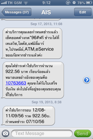 รบกวนตรวจสอบเบอร์ 085xxxx555 ได้ทำการชำระเงินไปเมื่อวันที่ 17/09/2013 เวลาประมาณ 11.08 น. แต่ยังได้รับ sms ว่ายังไม่ได้ชำระค่าบริการ