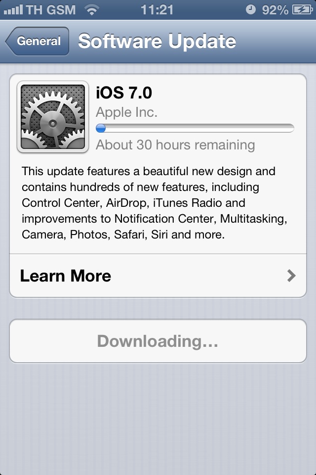 4S อัพผ่านเครื่อง โหลดปกติไม่มีปัญหา กด install มันค้างประมาณหน้าโลโก้ apple ประมาณ 35% มา 2 ชั่วโมงแล้ว ตอน อัพios7 ipad mini ไม่กี่นาทีก็เสร็จ มันมีปัญหารึเปล่าครับ อัพจาก ios5 เป็น 7 เลย