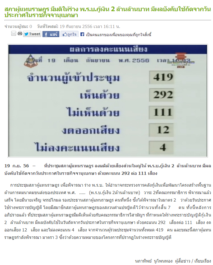 ที่ประชุมสภาผู้แทนราษฎร ลงมติผ่าน ชื่อร่างพ.ร.บ.ให้อำนาจกระทรวงการคลังกู้เงิน 2 ล้านล้านบาท เพื่อพัฒนาโครงสร้างพื้นฐานด้านคมนาคมขนส่งของประเทศ ตามร่างเดิม ด้วยมติ 286 ต่อ 103 เสียง