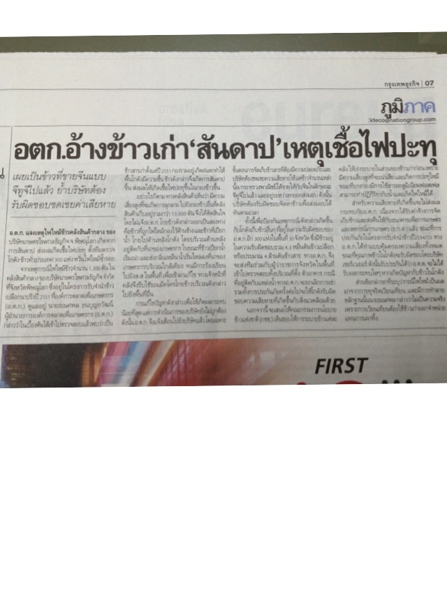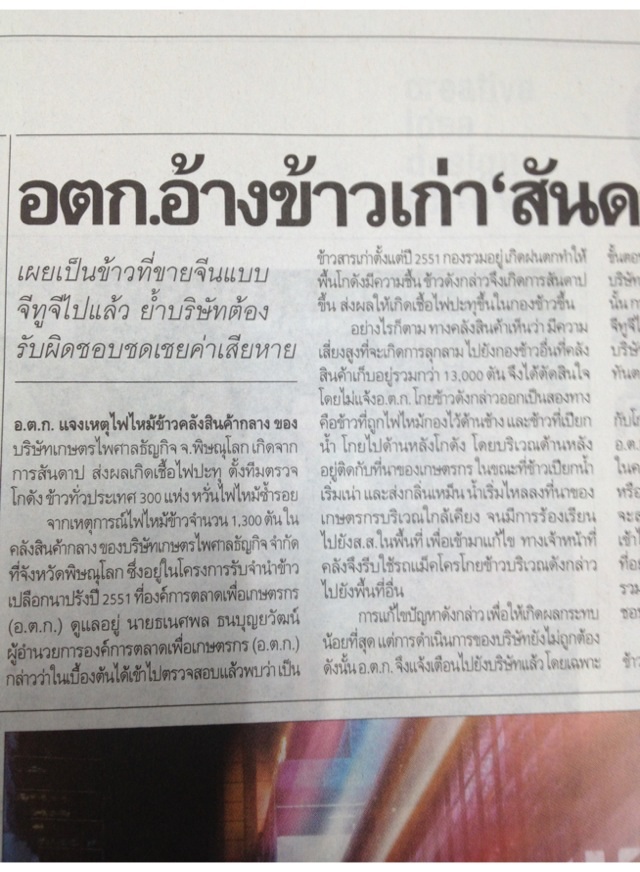 อตก.ชี้แจงเหตุไฟไหม้ข้าวคลังสินค้ากลาง ที่อยู่ในโครงการรับจำนำ เกิดการสันดาป ส่งผลให้เกิดเชื้อไฟประทุไฟไหม้ข้าวจำนวน1300ตัน