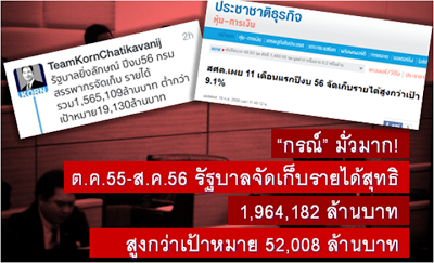 "การจัดเก็บรายได้รัฐบาลสุทธิในช่วง 11 เดือนแรกของปีงบประมาณ 2556 (ต.ค.55-ส.ค.56) มีจำนวนทั้งสิ้น 1,964,182 ล้านบาท สูงกว่าเป้าหมาย 52,008 ล้านบาท หรือร้อยละ 2.7 และสูงกว่าช่วงเดียวกันปีที่แล้วถึงร้อยละ 9.1"
