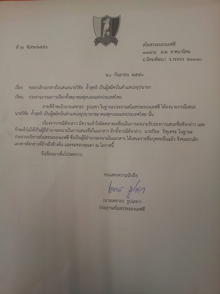 วันนี้ ระยอง เอฟซี ออกหนังสือยกเลิกเอกสารของ นาย วิชัย ล้ำสุทธิ เรียบร้อยแล้ว